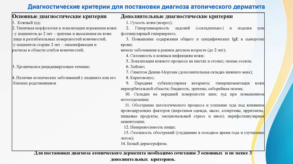 Для постановки диагноза атопического дерматита необходимо сочетание 3 основных и не менее 3