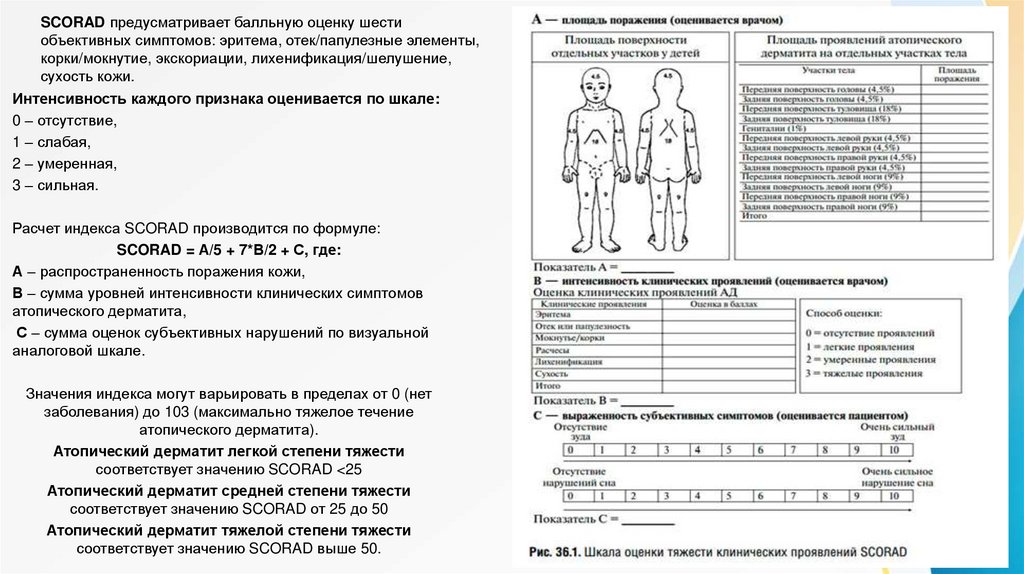 SCORAD предусматривает балльную оценку шестиобъективных симптомов: эритема, отек/папулезные элементы,