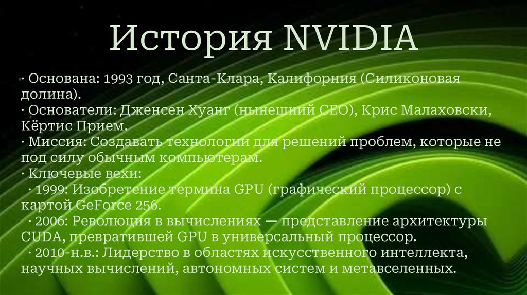 История NVIDIA· Основана: 1993 год, Санта-Клара, Калифорния (Силиконовая