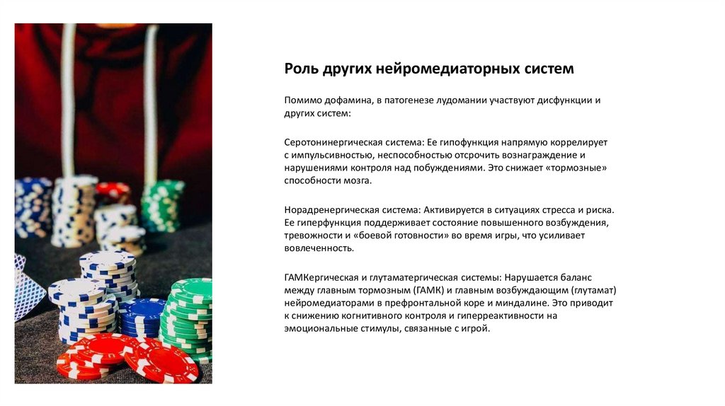 Роль других нейромедиаторных системПомимо дофамина, в патогенезе лудомании участвуют дисфункции и