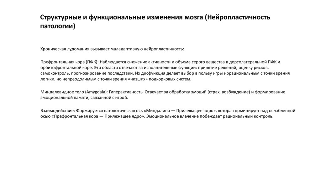 приобретенный дисбаланс нейромедиаторных систем (дофамин, серотонин, ГАМК/глутамат), приводящий к структурнофункциональной перестройке нейронных сетей, ответственных за вознаграждение, контроль импульсов и принятие решений.