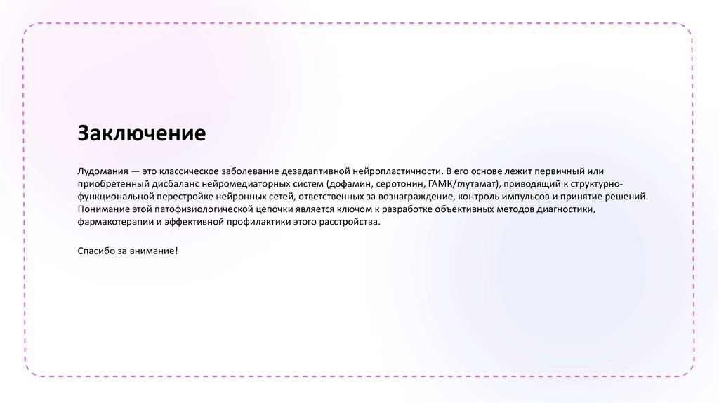 ЗаключениеЛудомания — это классическое заболевание дезадаптивной нейропластичности. В его основе лежит первичный или