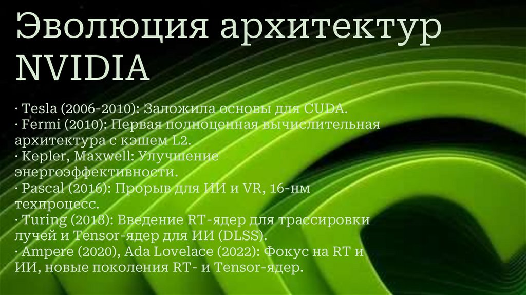 · Ampere (2020), Ada Lovelace (2022): Фокус на RT и