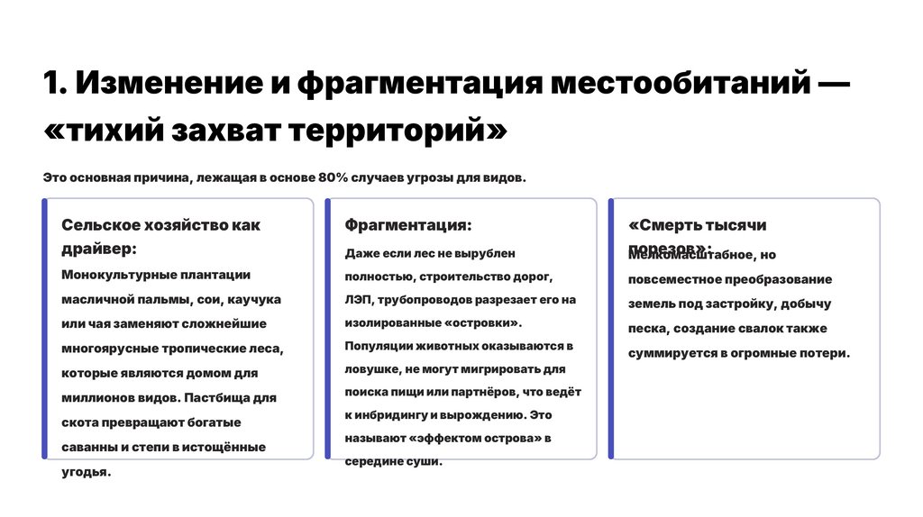 1. Изменение и фрагментация местообитаний —«тихий захват территорий»
