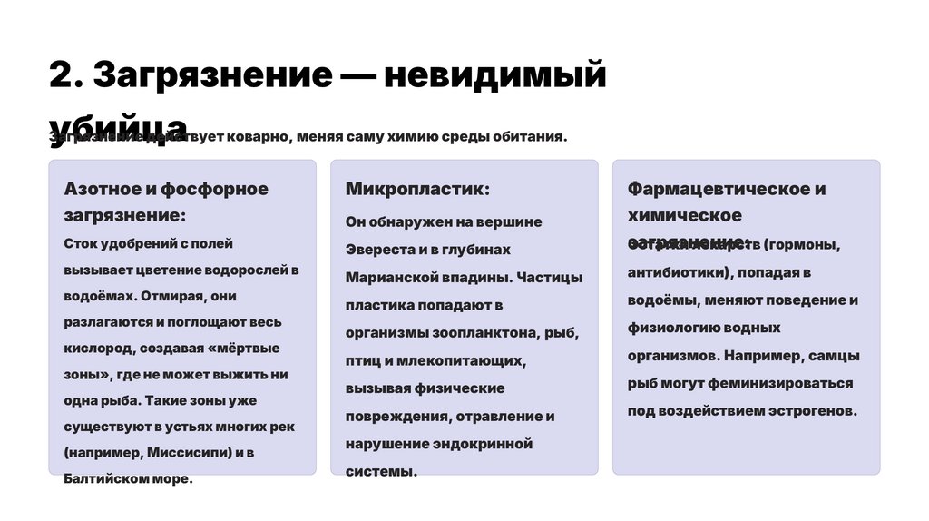 Загрязнение действует коварно, меняя саму химию среды обитания.