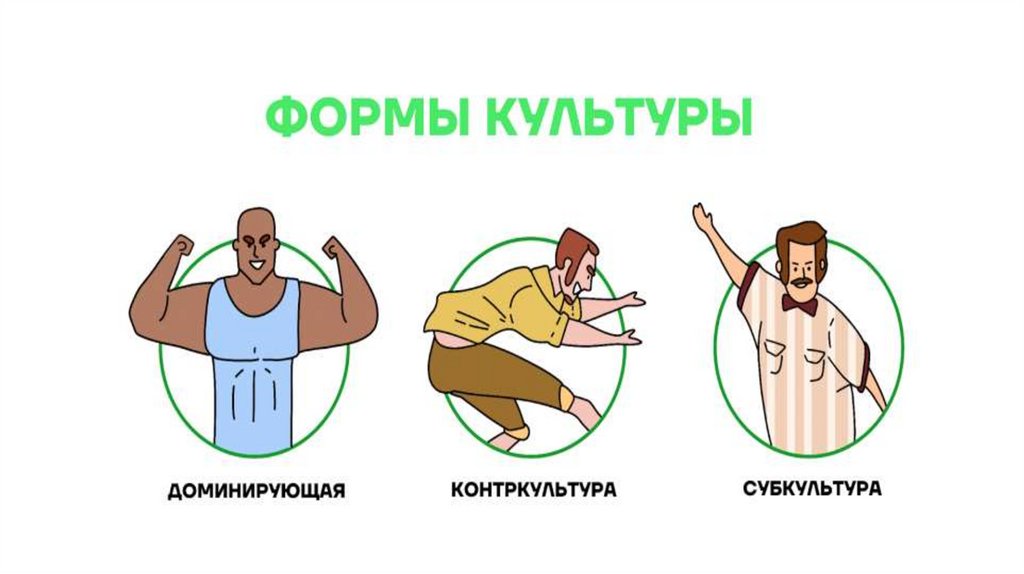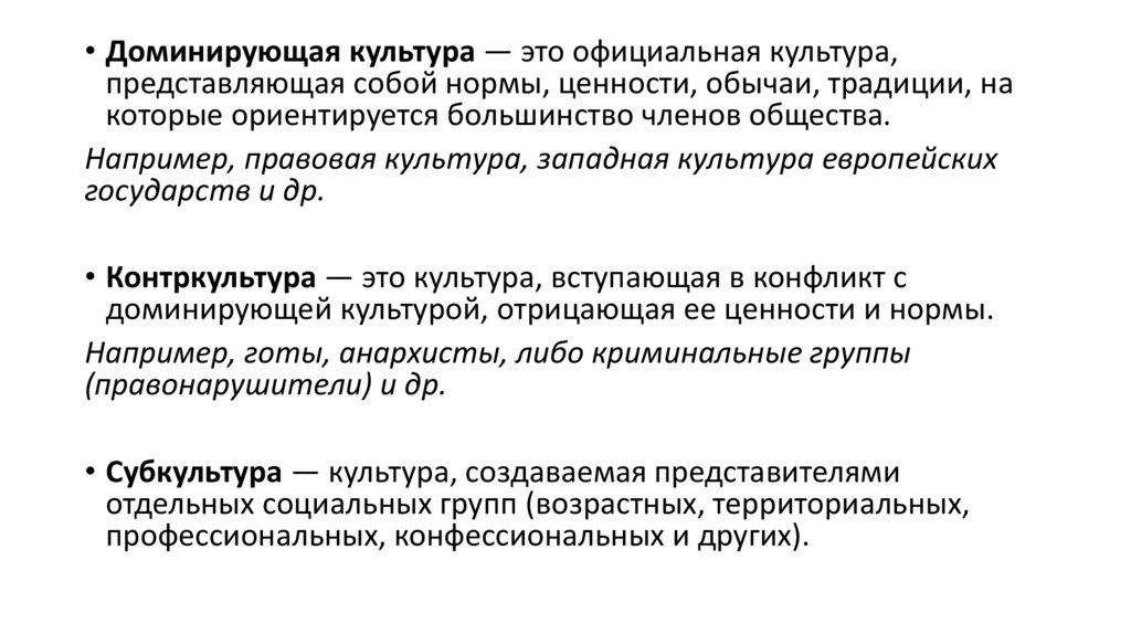 • Доминирующая культура — это официальная культура,представляющая собой нормы, ценности, обычаи, традиции, на
