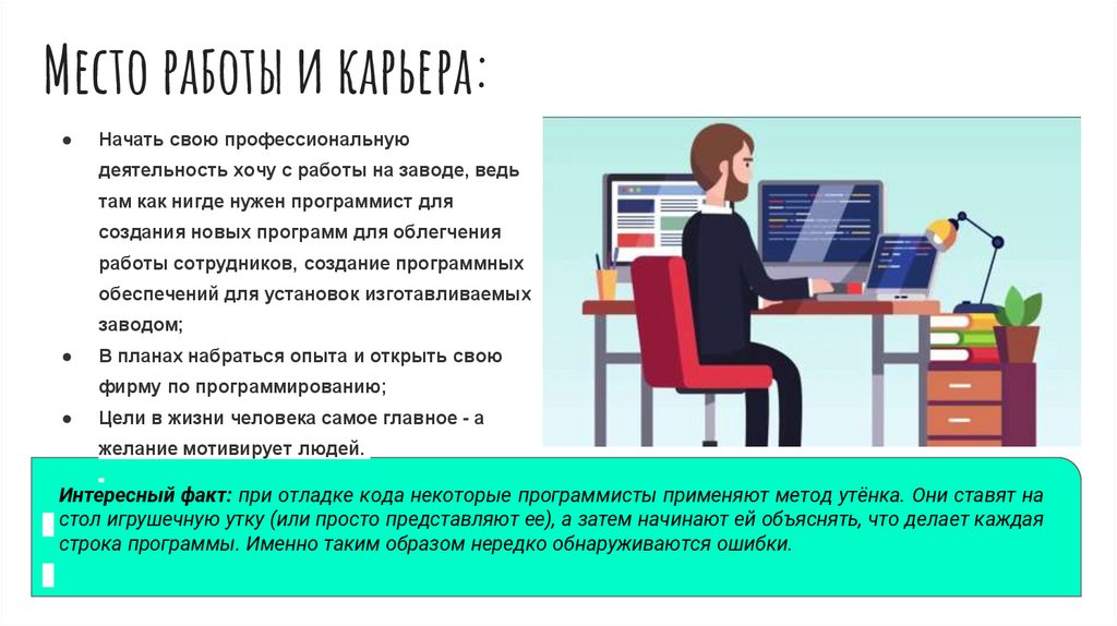 Интересный факт: при отладке кода некоторые программисты применяют метод утёнка. Они ставят на