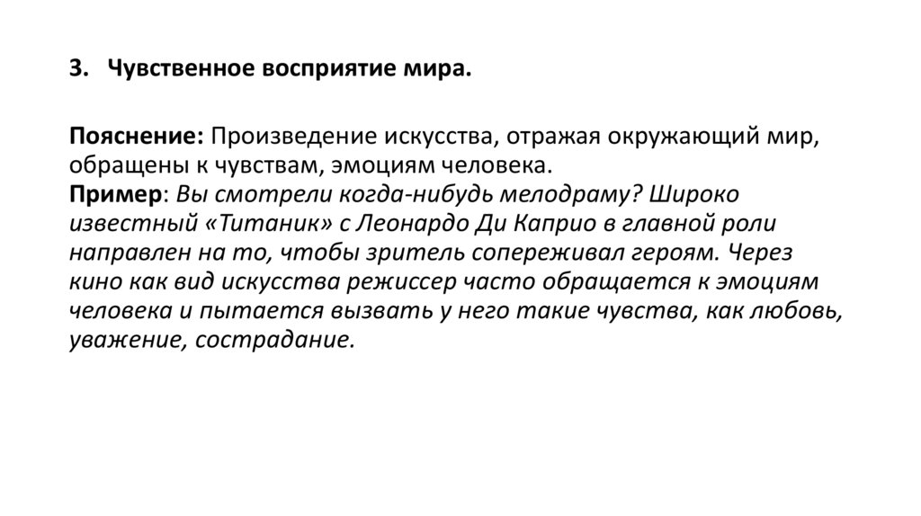 3. Чувственное восприятие мира.Пояснение: Произведение искусства, отражая окружающий мир,