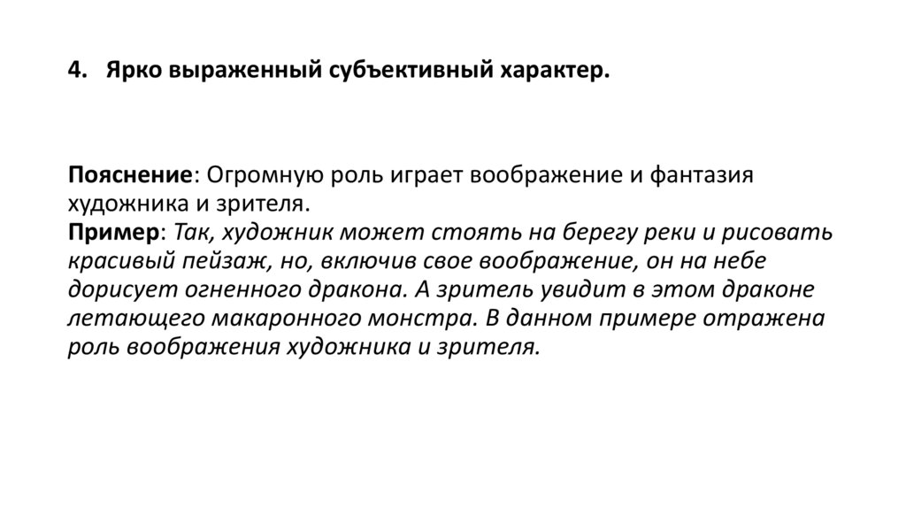 4. Ярко выраженный субъективный характер.Пояснение: Огромную роль играет воображение и фантазия