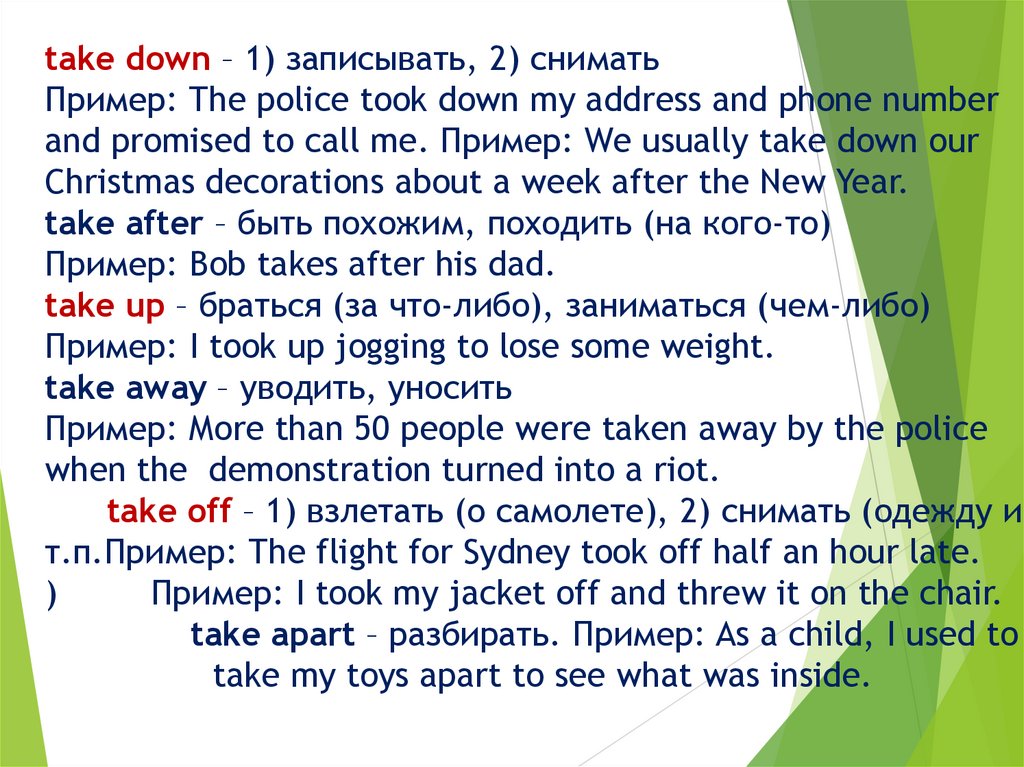 take down – 1) записывать, 2) сниматьПример: The police took down my address and phone number