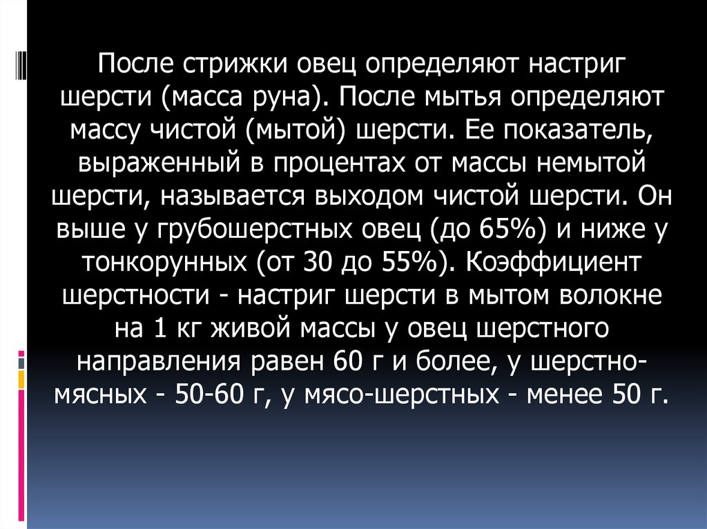 направления равен 60 г и более, у шерстномясных - 50-60 г, у мясо-шерстных - менее 50 г.