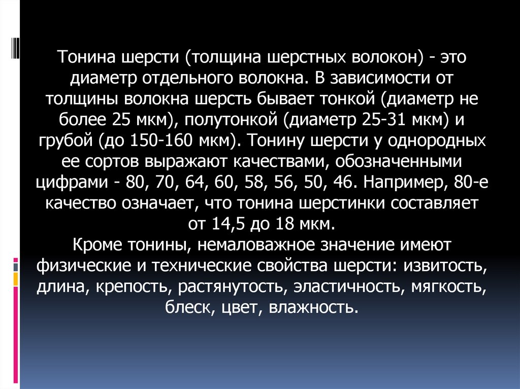 Тонина шерсти (толщина шерстных волокон) - этодиаметр отдельного волокна. В зависимости от