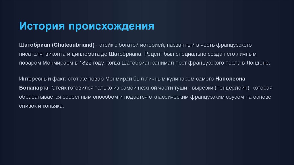 История происхожденияШатобриан (Chateaubriand) - стейк с богатой историей, названный в честь французского