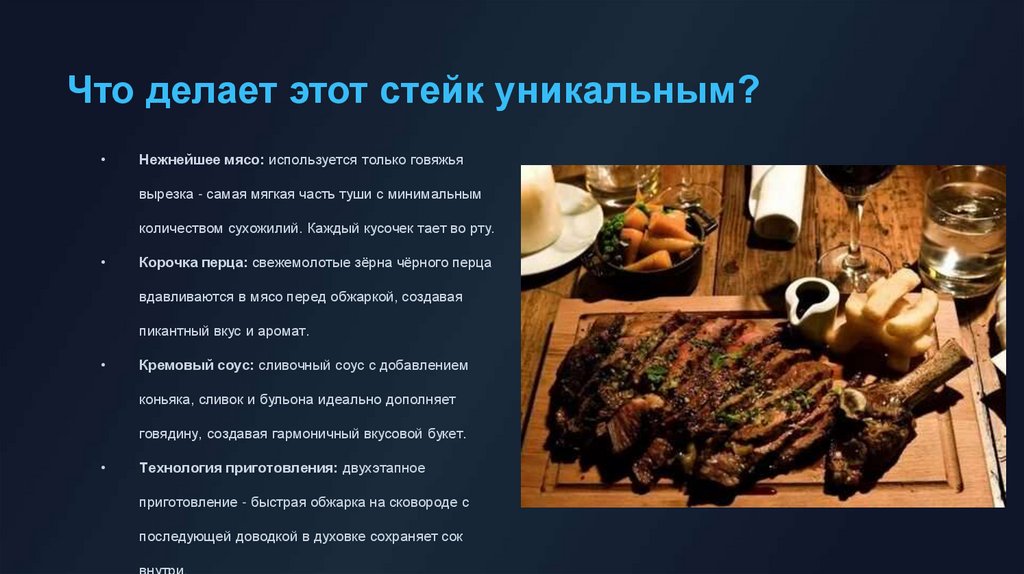 Что делает этот стейк уникальным?Нежнейшее мясо: используется только говяжья
