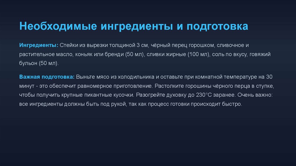Необходимые ингредиенты и подготовкаИнгредиенты: Стейки из вырезки толщиной 3 см, чёрный перец горошком, сливочное и