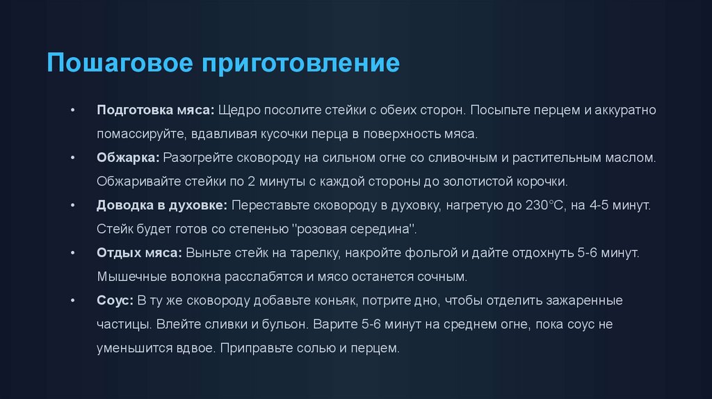 Идеальная подача и советы гурманаПрезентация блюда: Уложите горячий стейк на предварительно прогретую тарелку, обильно