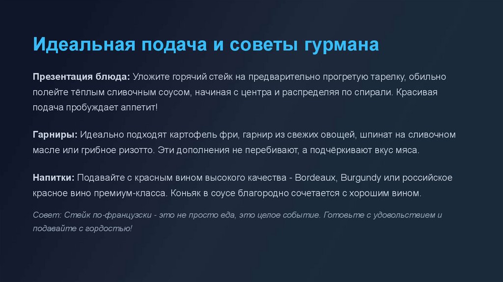 Совет: Стейк по-французски - это не просто еда, это целое событие. Готовьте с удовольствием и