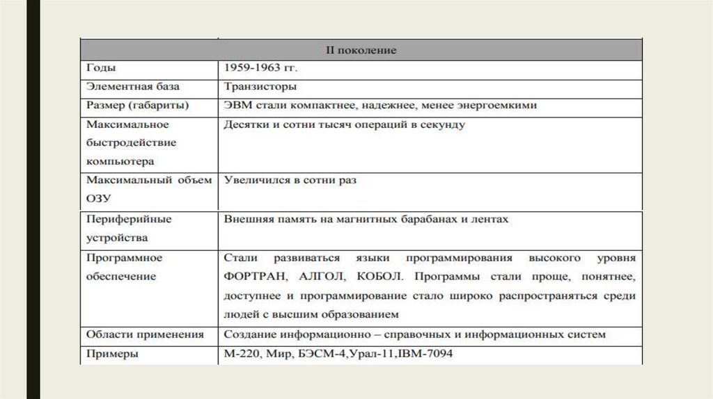 2-е поколение ЭВМ (с конца 50-х годов). Элементная база – полупроводниковые