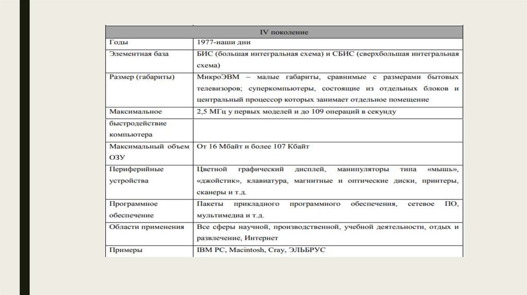 4-е поколение ЭВМ (с конца 70-х годов по настоящее время). Элементная база –