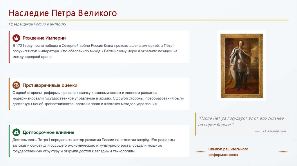 Деятельность Петра I определила вектор развития России на столетия вперёд. Его реформы