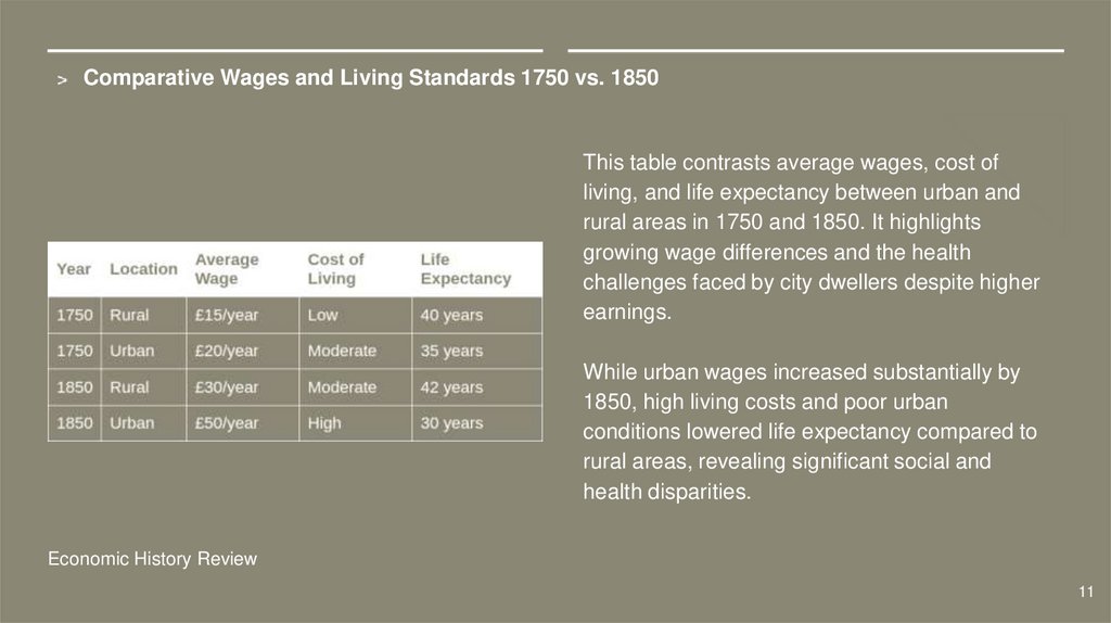 Comparative Wages and Living Standards 1750 vs. 1850This table contrasts average wages, cost of