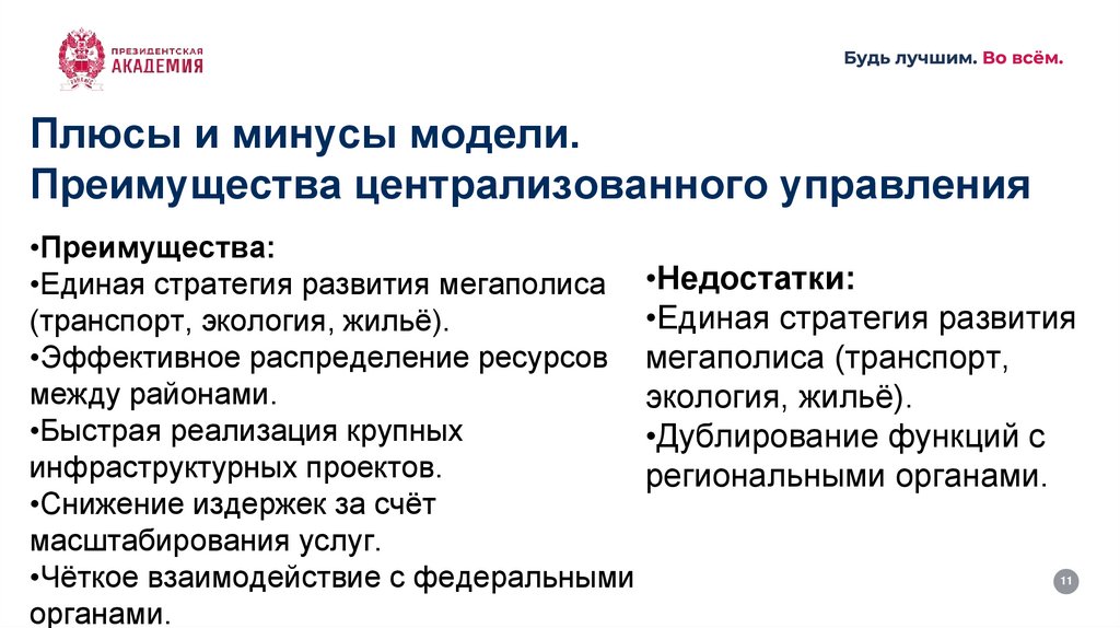 •Единая стратегия развития мегаполиса •Недостатки: