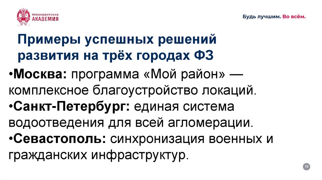 Примеры успешных решенийразвития на трёх городах ФЗ