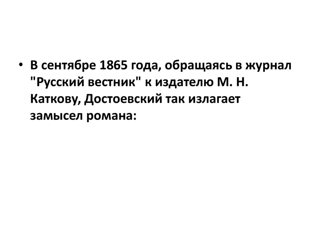 • В сентябре 1865 года, обращаясь в журнал"Русский вестник" к издателю М. Н.
