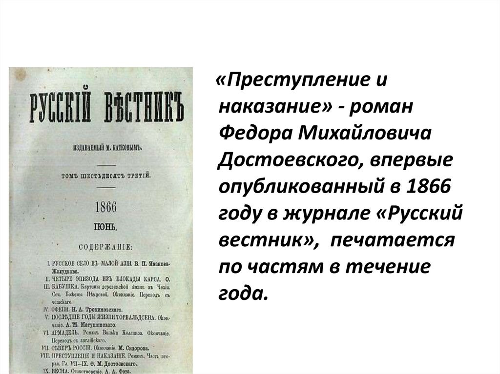 январь 1866 г. – публикация I части романа,