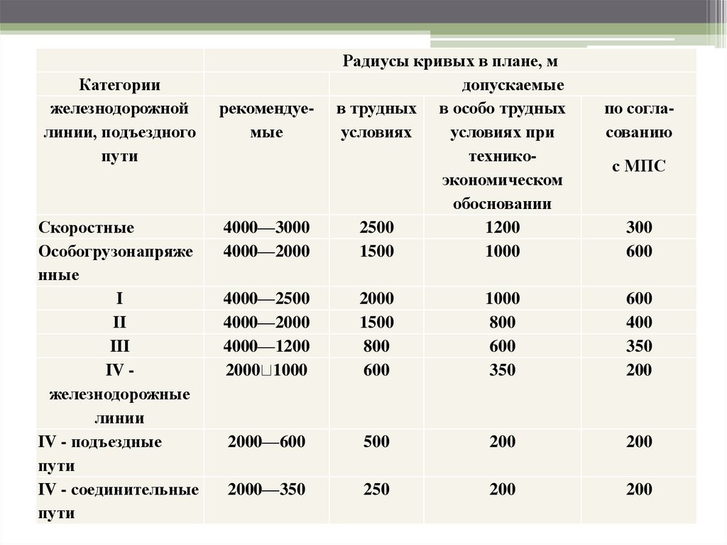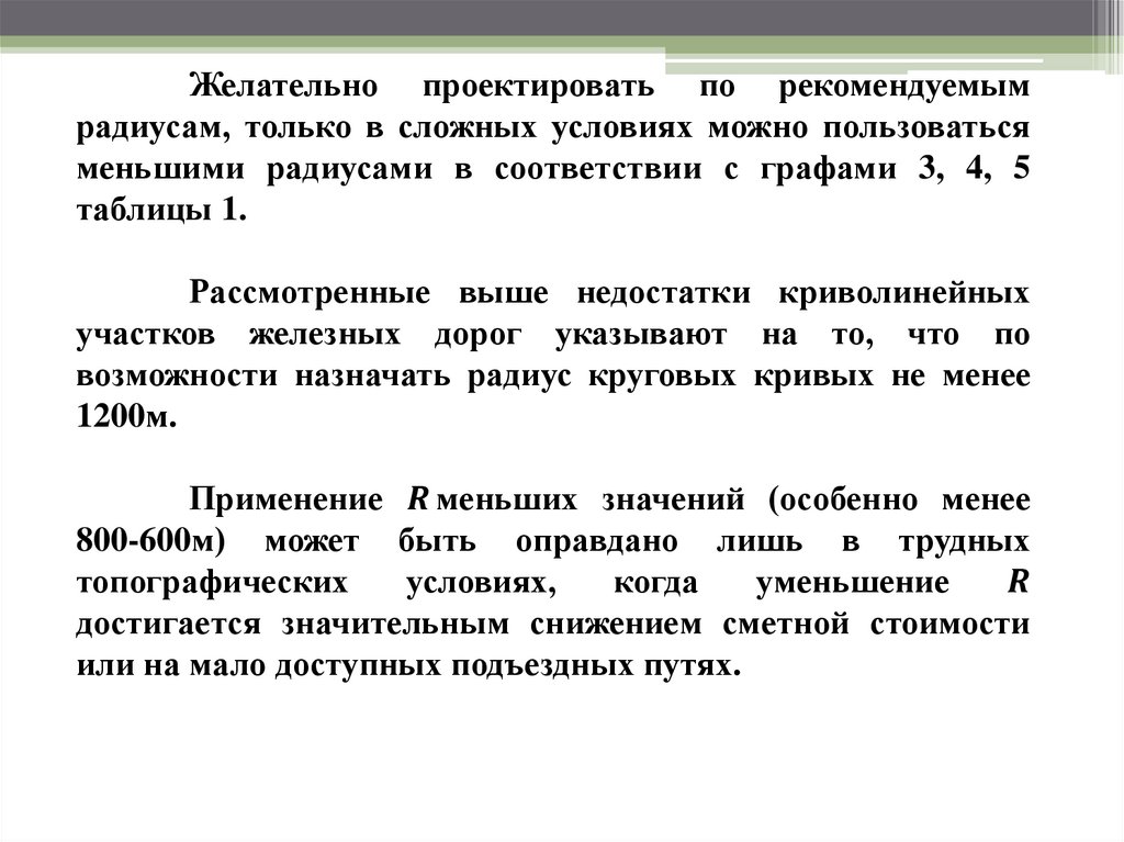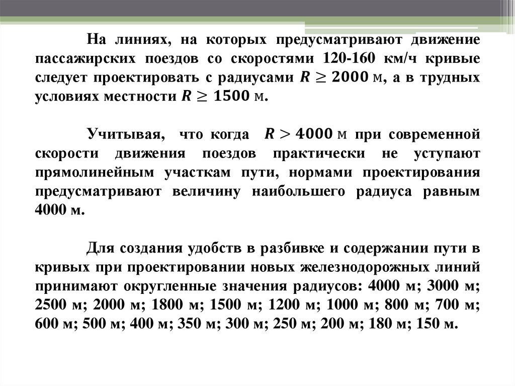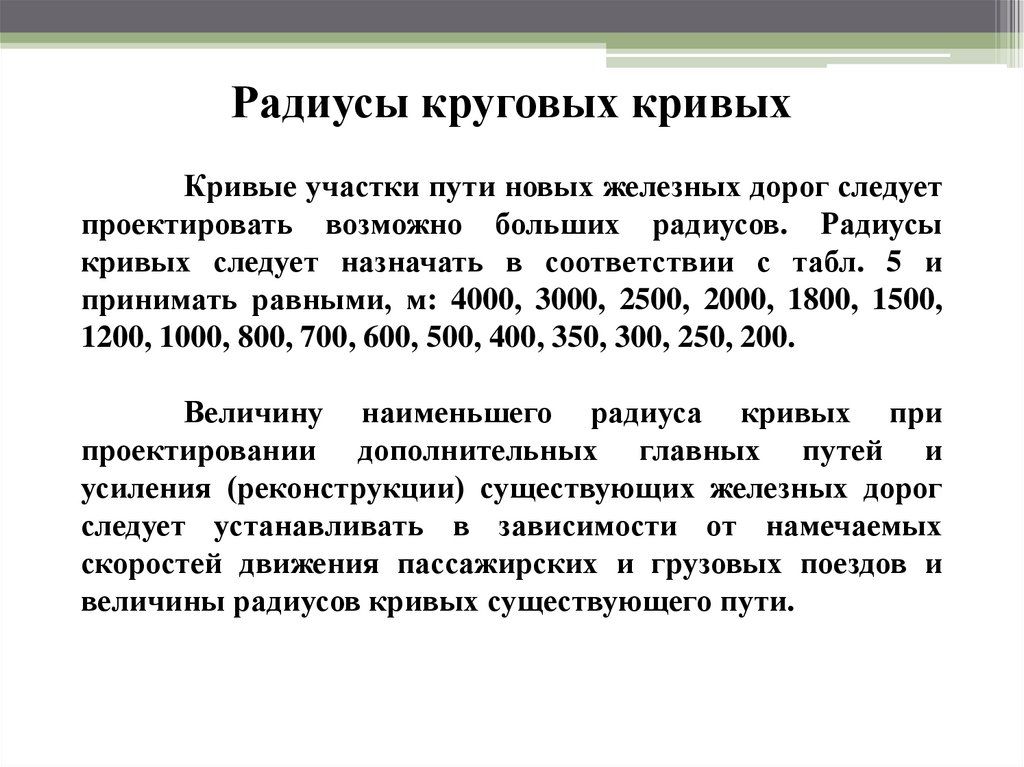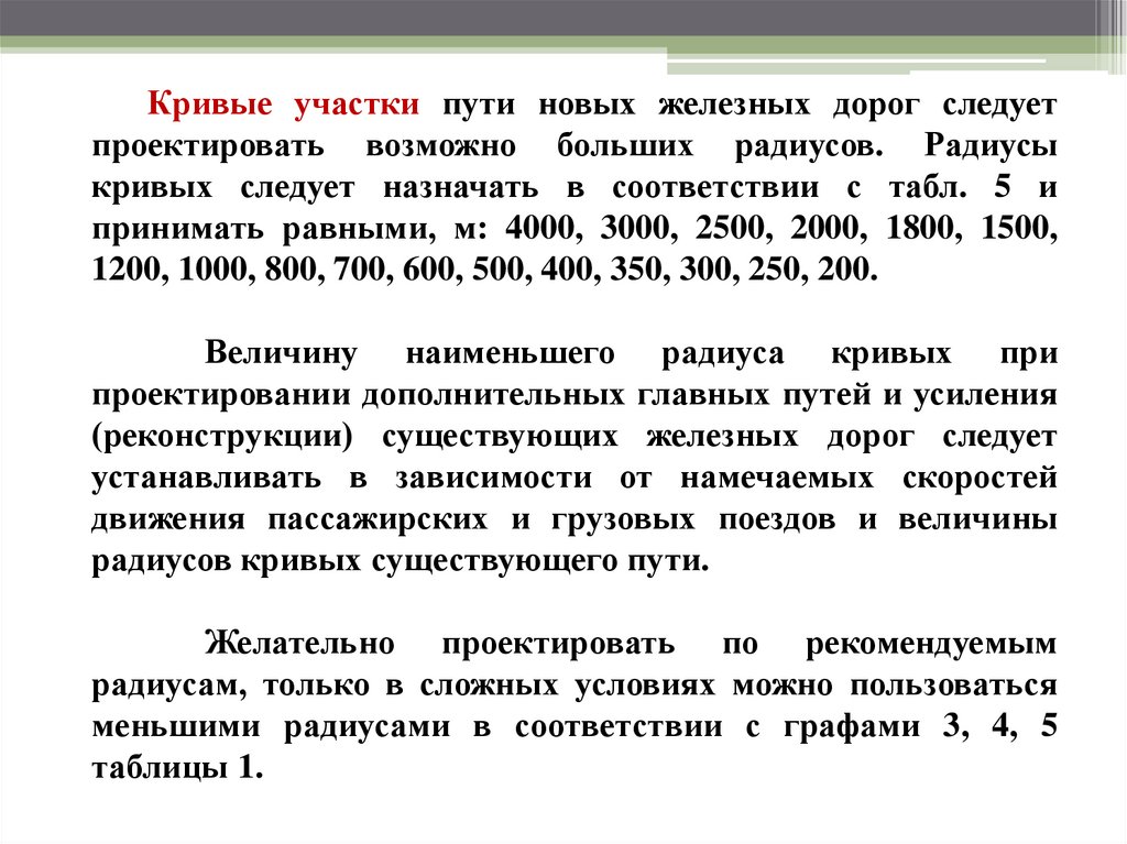 Кривые участки пути новых железных дорог следуетпроектировать возможно больших радиусов. Радиусы