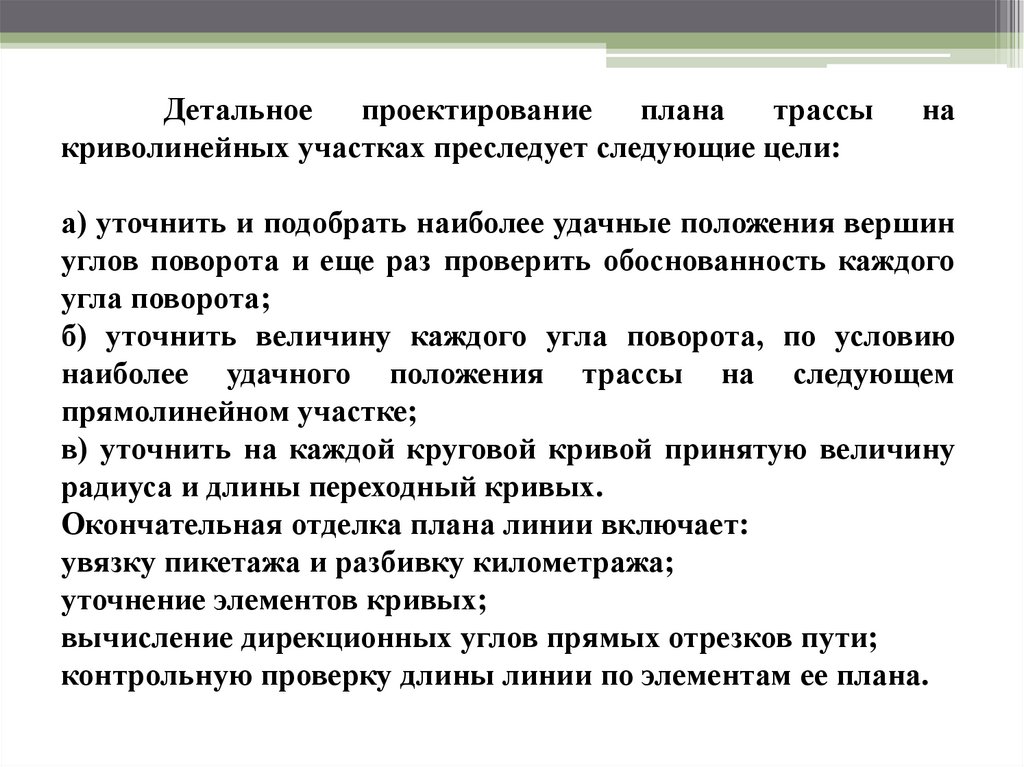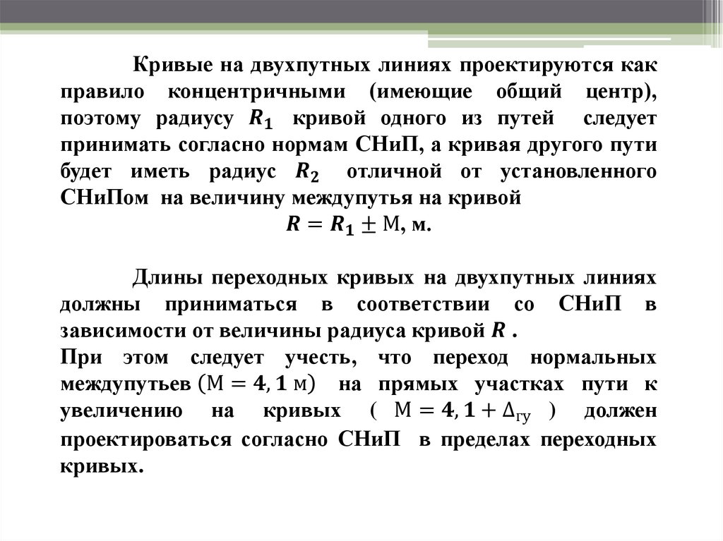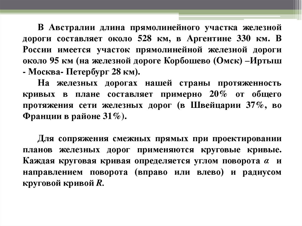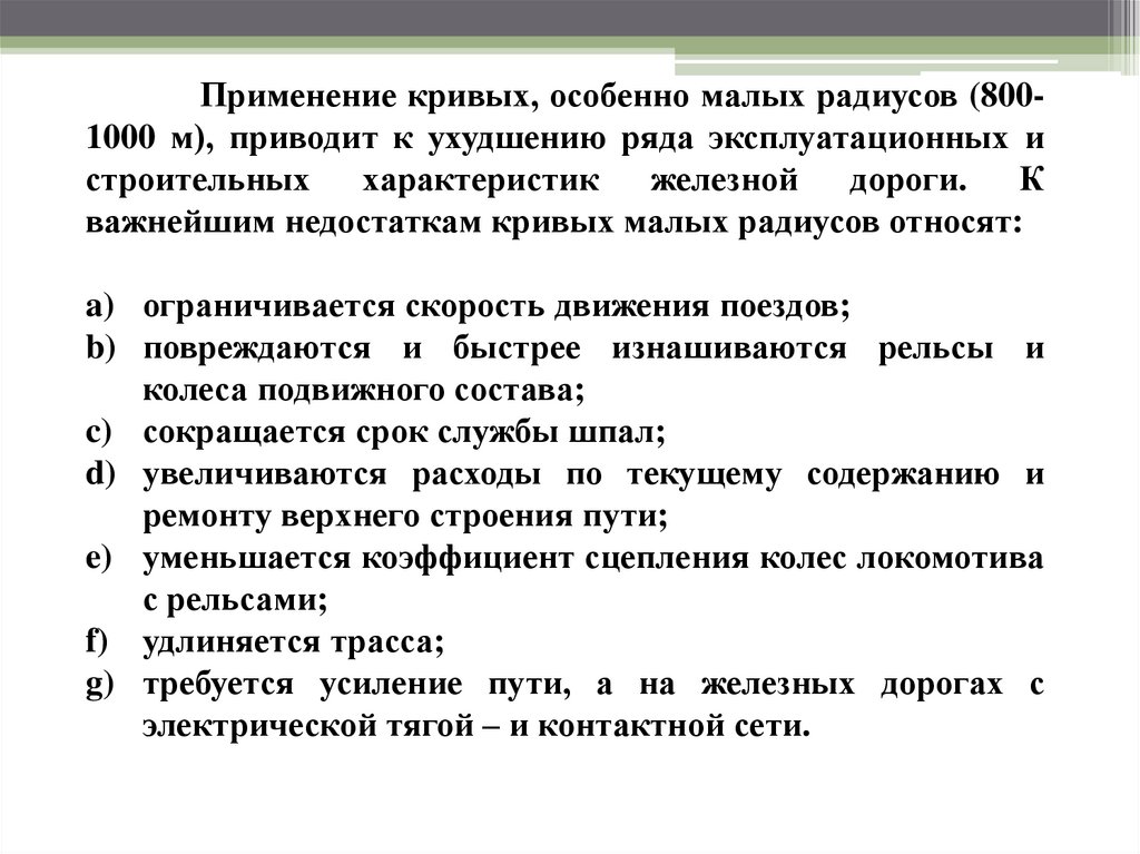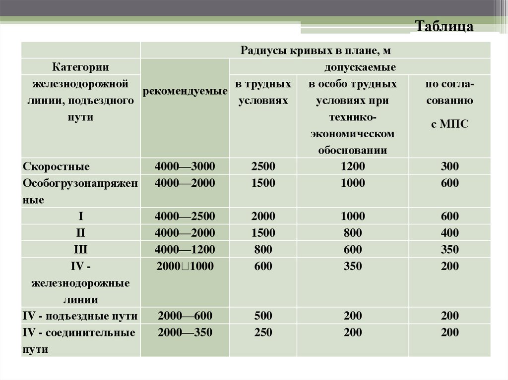 Кривые участки пути новых железных дорог следуетпроектировать возможно больших радиусов. Радиусы