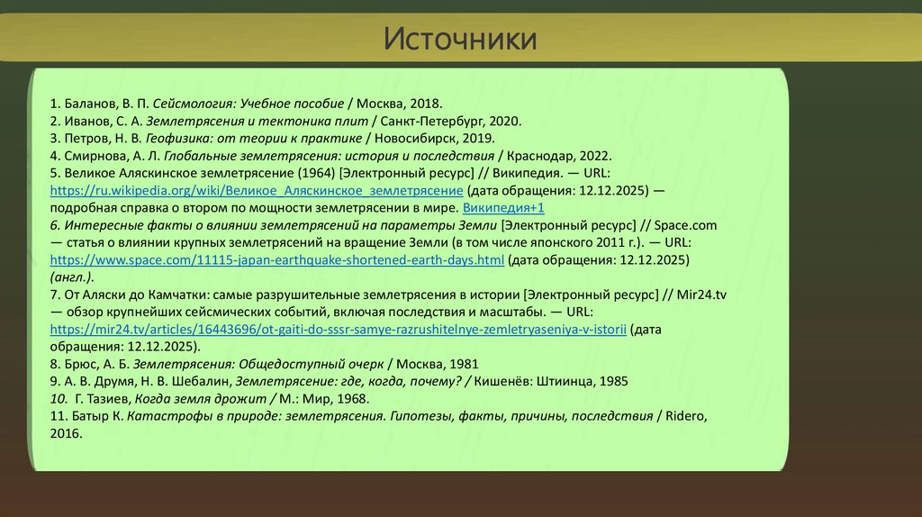 Источники1. Баланов, В. П. Сейсмология: Учебное пособие / Москва, 2018.