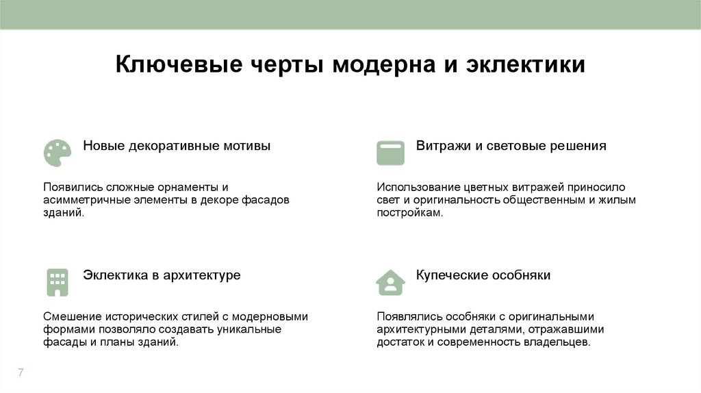 Ключевые черты модерна и эклектикиНовые декоративные мотивы