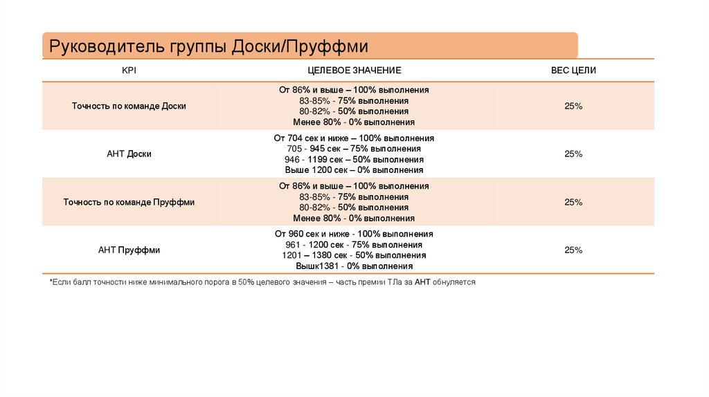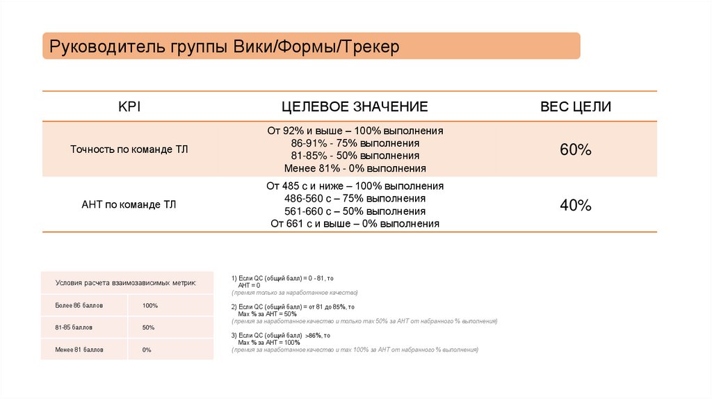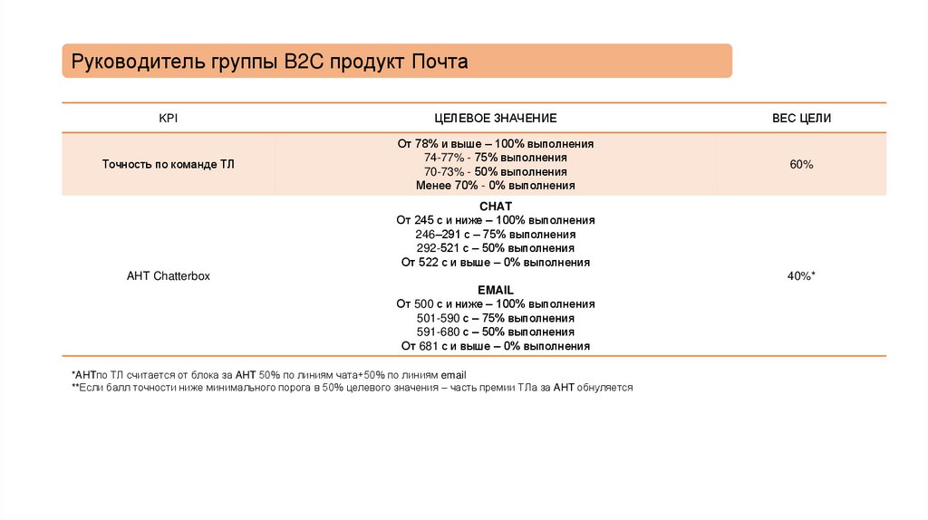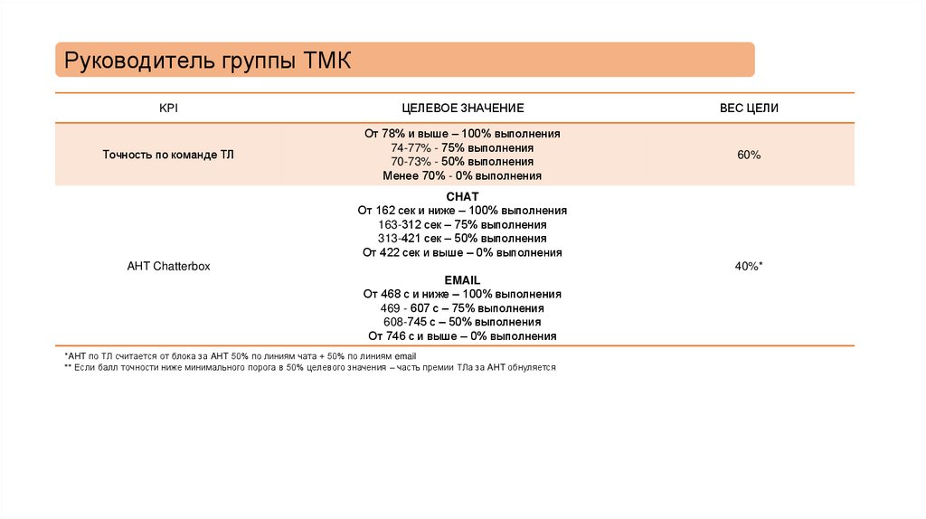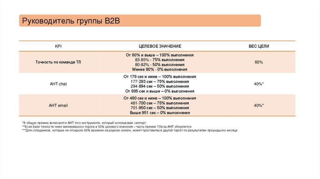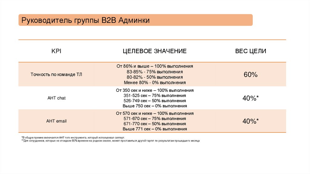 *Если балл точности ниже минимального порога в 50% целевого значения – часть премии ТЛа за AHT обнуляется