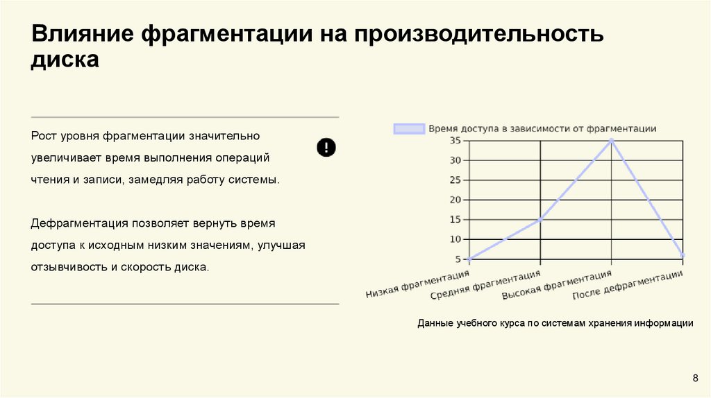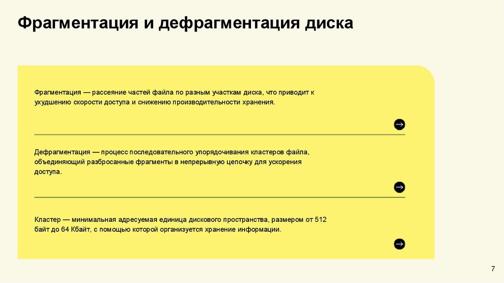 Фрагментация и дефрагментация дискаФрагментация — рассеяние частей файла по разным участкам диска, что приводит к