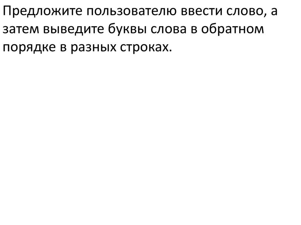Предложите пользователю ввести слово, азатем выведите буквы слова в обратном
