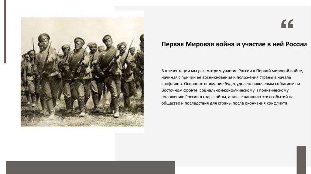 Первая Мировая война и участие в ней РоссииВ презентации мы рассмотрим участие России в Первой мировой войне,