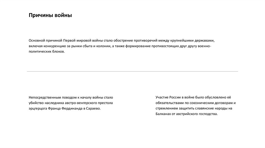 Причины войныОсновной причиной Первой мировой войны стало обострение противоречий между крупнейшими державами,
