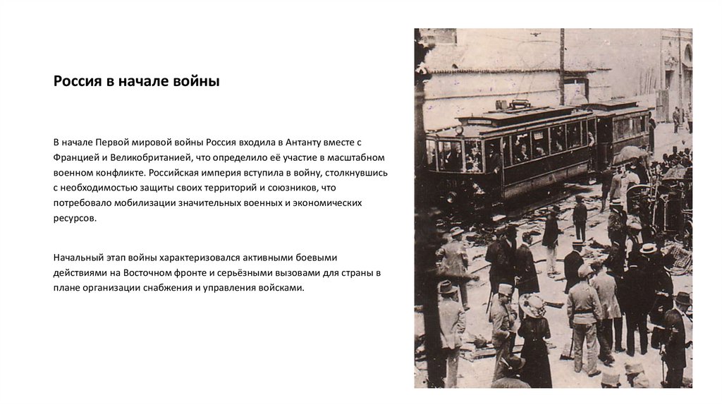 Россия в начале войныВ начале Первой мировой войны Россия входила в Антанту вместе с