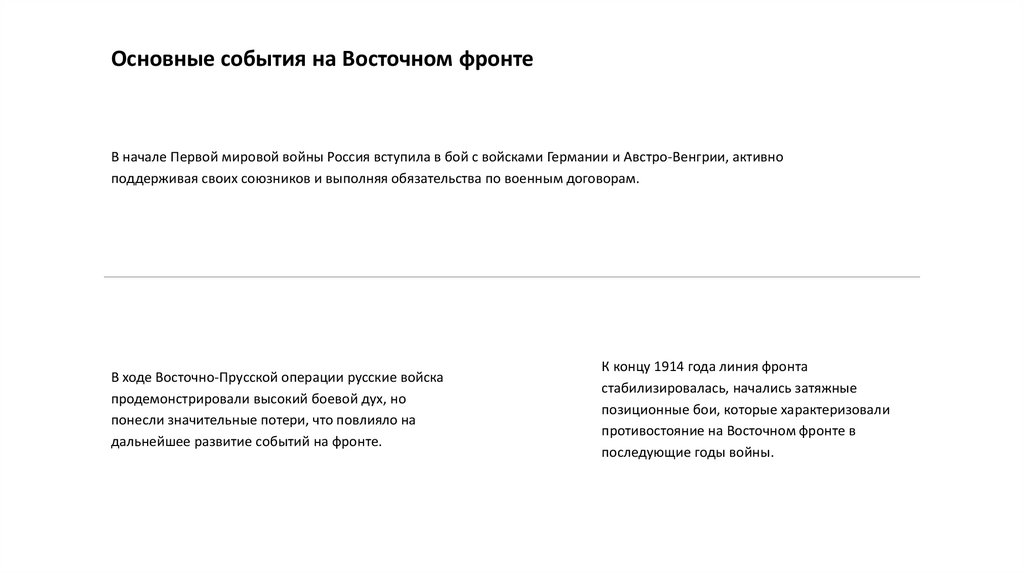 Основные события на Восточном фронтеВ начале Первой мировой войны Россия вступила в бой с войсками Германии и Австро-Венгрии, активно