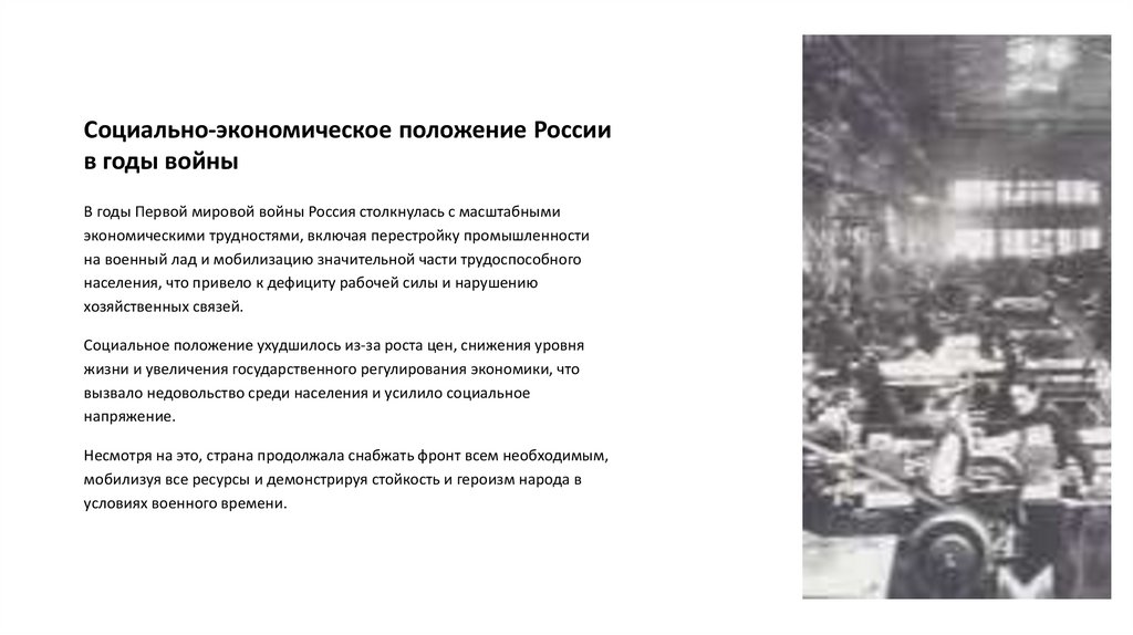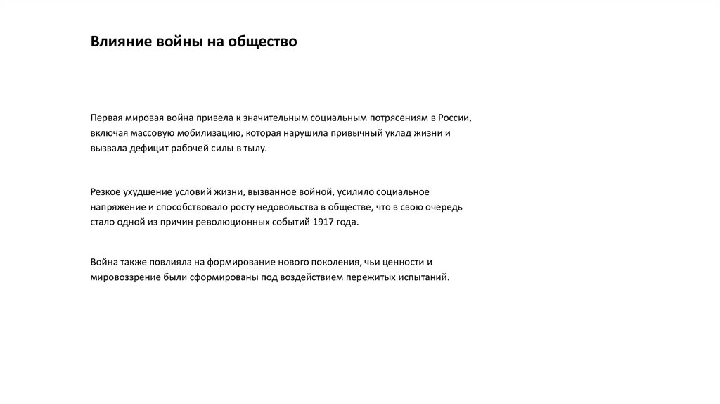 Влияние войны на обществоПервая мировая война привела к значительным социальным потрясениям в России,