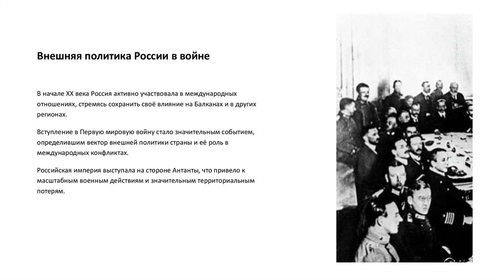 Внешняя политика России в войнеВ начале XX века Россия активно участвовала в международных