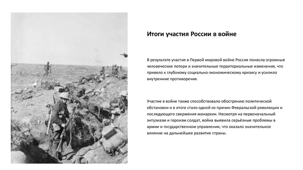 Итоги участия России в войнеВ результате участия в Первой мировой войне Россия понесла огромные