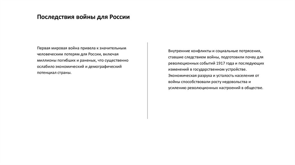 Последствия войны для РоссииПервая мировая война привела к значительным