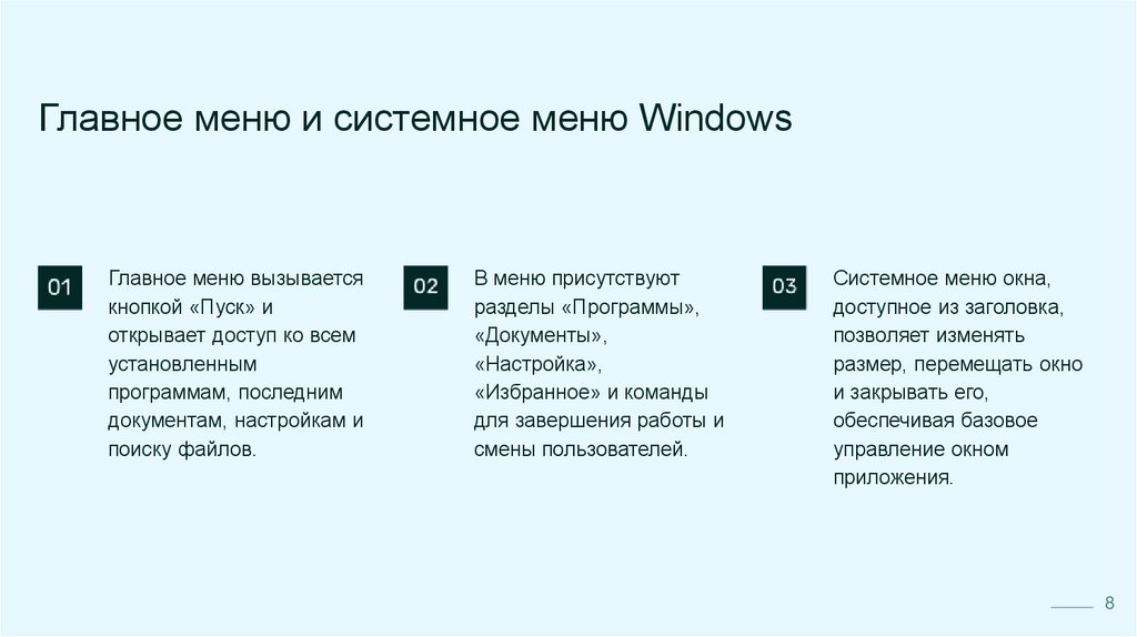 Структура и виды меню в WindowsГлавное меню служит для доступа к программам, документам, настройкам и завершению