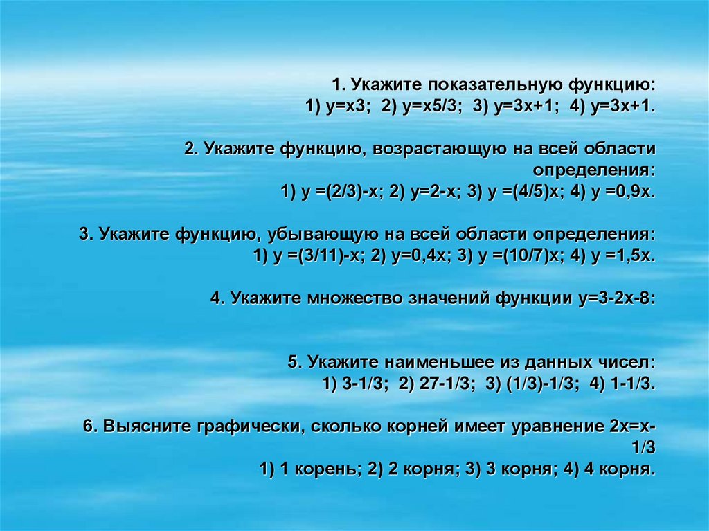 1. Укажите показательную функцию:1) у=х3; 2) у=х5/3; 3) у=3х+1; 4) у=3х+1.