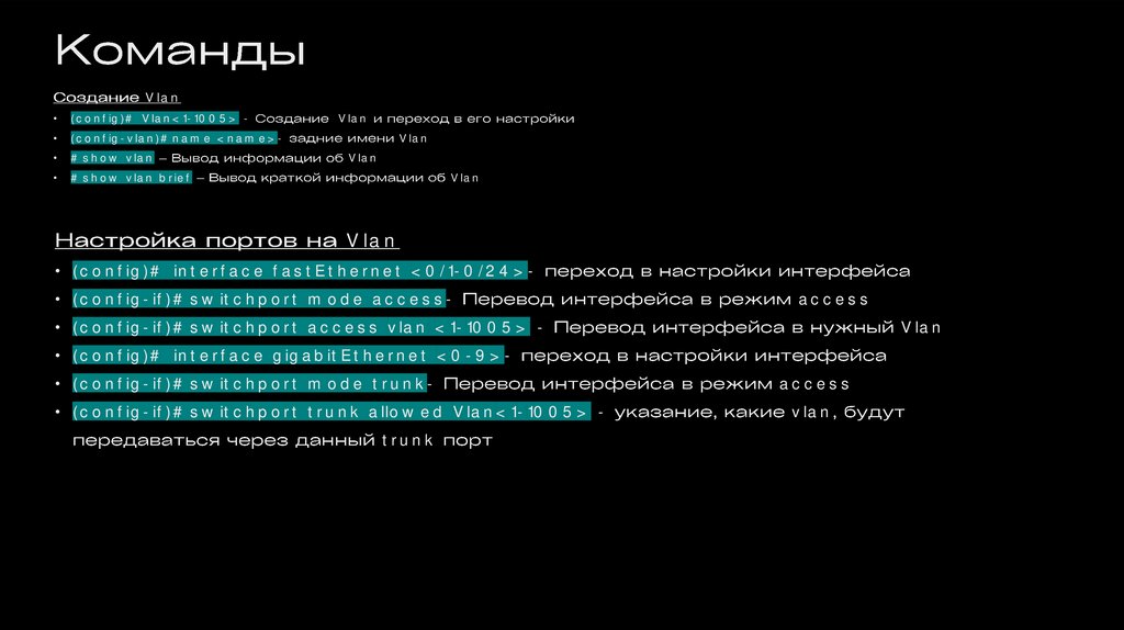 • (config)# interface gigabitEthernet <0-9>• (config-if)#switchport mode trunk• (config-if)#switchport trunk allowed Vlan<1-1005> trunk