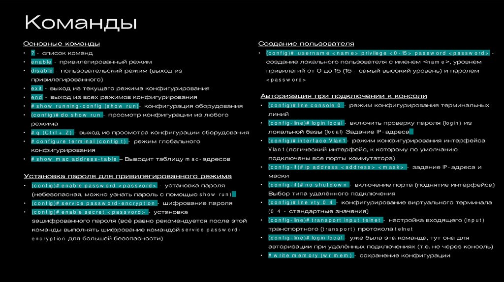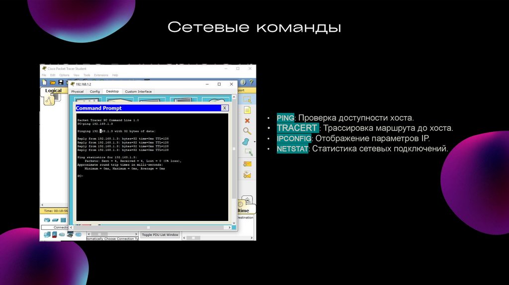• PING: Проверка доступности хоста.• TRACERT : Трассировка маршрута до хоста.