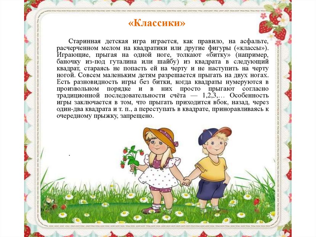 «Классики»Старинная детская игра играется, как правило, на асфальте,