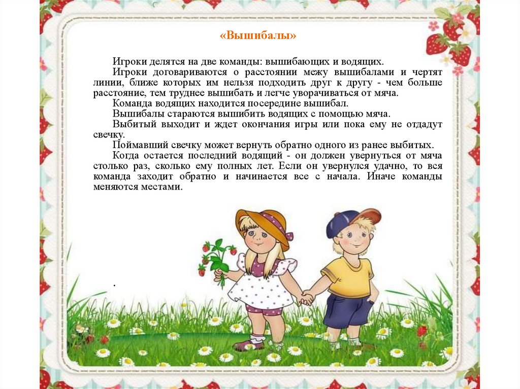 «Вышибалы»Игроки делятся на две команды: вышибающих и водящих.